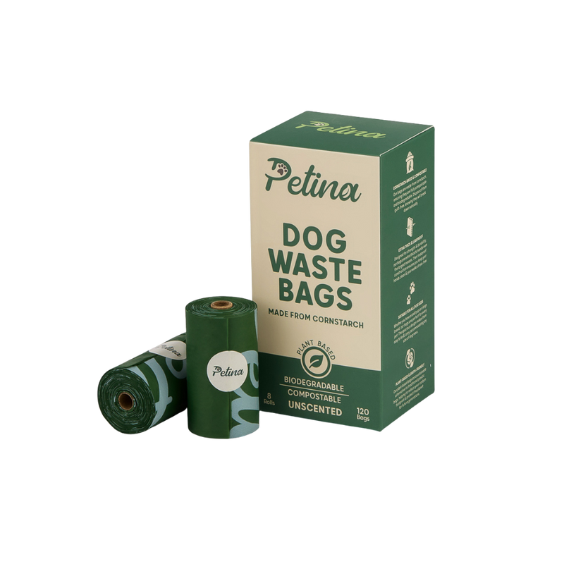 Petina poo bags are made from 100% plant-based materials and are certified biodegradable and compostable. Unlike traditional plastic bags, they break down completely without leaving harmful microplastics behind, making them a truly sustainable choice.